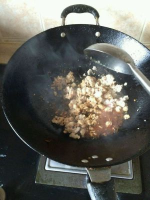 锅中放少许油,将猪肉馅放入煸炒,炒至肉变色了,放少许酱油,炒均匀后盛出备用