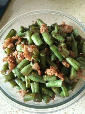锅中留少许底油,不要太多哦。下姜蒜辣椒花椒一起煸炒出香味后,放入肉末煸干并放入老干妈与豆瓣酱,然后下四季豆翻炒片刻,加入料酒.盐.鸡精.味精.糖,最后撒上葱花!大功告成^_^