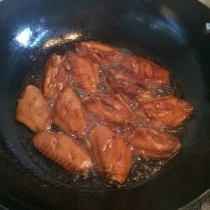 倒入没过鸡翅的可乐 少许老抽 按需放盐 小火炖煮 大火收汁