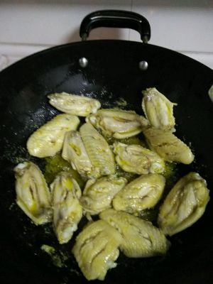 腌制完成后,起油。将腌好的鸡翅放入油锅煎,直双面金黄后放入葱姜蒜,不停翻炒,以免粘锅。