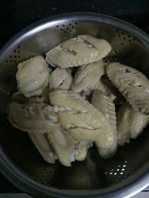 烧水,水开后放入鸡翅,约一分钟,待鸡翅皮发白,没有红色时关火。取出鸡翅,过凉水。