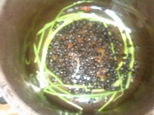 电高压锅内胆底部铺上葱姜,放入桂皮八角.