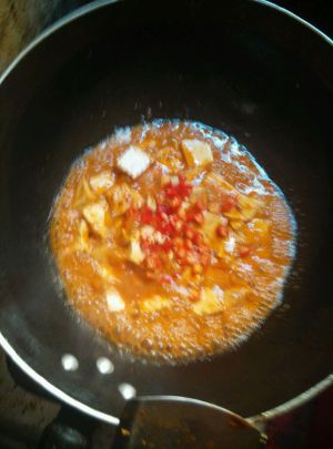 等豆腐变成金黄色倒入蒜蓉酱,小火慢慢的炖,等到酱吸收到豆腐里,就可以出锅了。