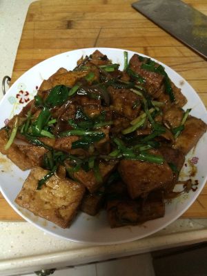 将生抽,老抽,蚝油,白醋,糖,水放入碗中搅拌均匀,另起锅加少许油,热后加入葱花,姜,煸炒,出香味后,将调好的汁倒入锅内,熬制成浓稠状再降控好油的豆腐倒入锅中,加入韭菜段,翻炒均匀即可盛盘,时间久了豆腐就不脆了。
