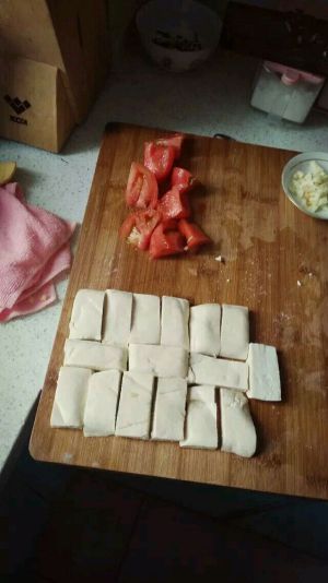 把老豆腐切块,那种不厚不薄的,我觉得长方形比较好看。