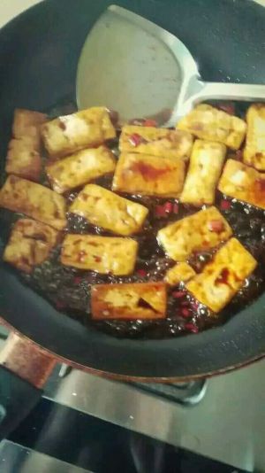 翻炒(ฅ>ω<*ฅ)让我们一起摇摆~炒到之前的汁水变成粘稠的酱,多泡会让豆腐入味。