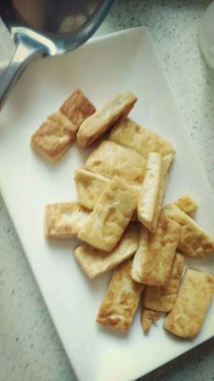 锅里加入多些的油预热,往锅里加入一大勺盐,将控过水的豆腐放进油锅里炸,一面发黄了翻面炸另一面,直到两面都发黄,油温不宜太热,炸的时间不宜太久,否则豆腐块发硬,不好吃。煎炸好的豆腐捞出控油,炸过豆腐的油倒掉或者自己保存下