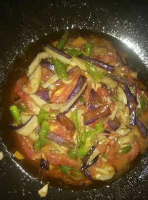 先把茄子切条,放在油里炸。捞起来,然后去掉一点油,放大蒜辣椒下去炒30秒,在下西红柿,加一小勺糖口感更好,西红柿炒软了一些后,把茄子放下去拌,加盐和味精,至炒熟起锅。