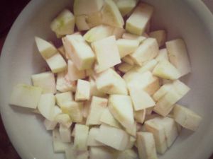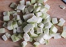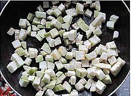 把茄子去皮后切成方丁;