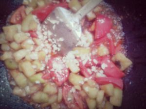 放入西红柿蒜末盐白糖生抽调味。翻炒出锅