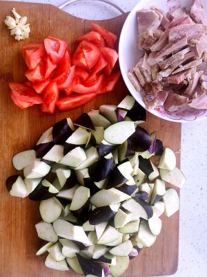 西红柿,茄子洗净切滚刀块,熟肉切片,蒜切末