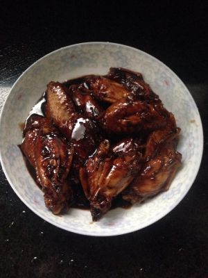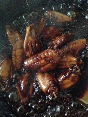 锅热后倒入半瓶可乐,随即将翅根倒入,加老抽,十三香,开锅后转小火,十分钟后大火收汁,加少许盐。