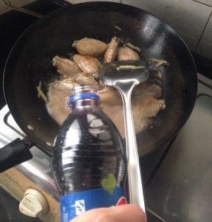 锅入油,将葱白,蒜,姜爆香后下鸡翅煎!然后到可乐淹没过鸡翅!加盖!