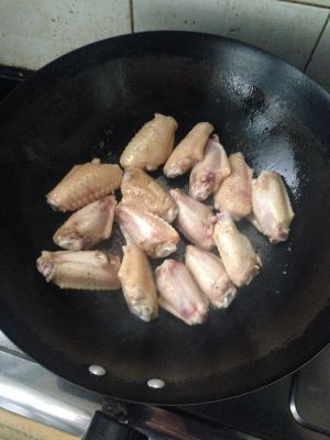 锅烧热放少许油、然后在把鸡翅放进锅里翻炒、炒到鸡翅两面黄!