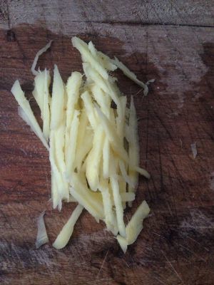 直接将鸡翅放入锅中煎,煎至两面金黄,放入姜丝翻炒一下。