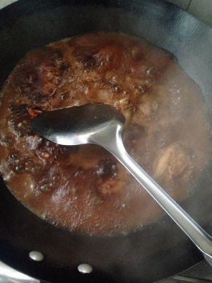 把剩下的腌料和可乐一起倒锅里 盖上盖子焖
