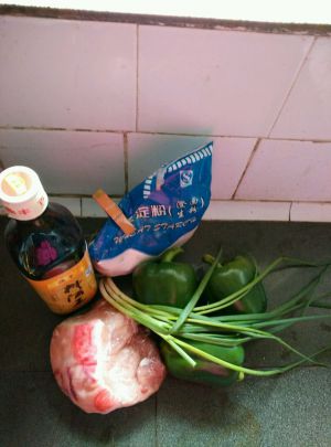 锅入少量油,放入大葱和青椒炒3分钟左右,炒至有点蔫放入一旁的肉丝下锅一起炒,加入盐,起锅前加入鸡精。