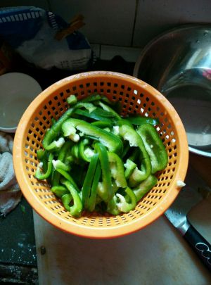 趁腌肉的时候开始切青椒,青椒切成细丝,细一点好吃一点。切完青椒就可以开始炒了。