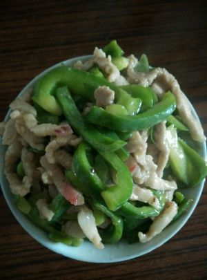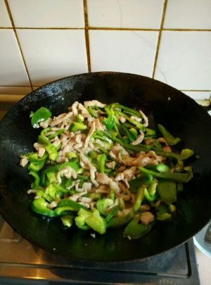 油热,放入腌好的肉丝,赶紧用锅铲铲开,避免粘住,因为有淀粉嘛。炒个一分多钟,放入青椒,再炒个一分多钟,就可以放盐,味精,起锅了。