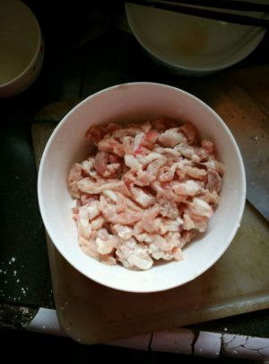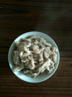 瘦肉切丝 放黄酒一勺 盐二勺 淀粉三勺拌匀 备用(30分钟)