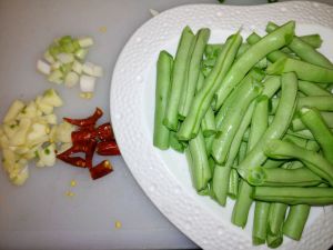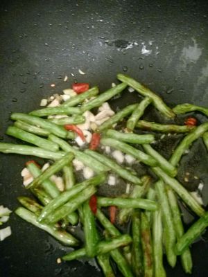 再倒油少量,葱姜蒜干辣椒放入。爆香后,放入四季豆。继续煸炒