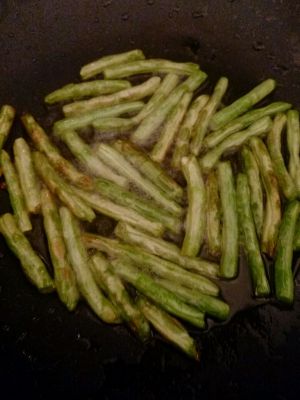 倒很少的油,热锅后放入切成中段的四季豆。四季豆记得洗净拔去老筋