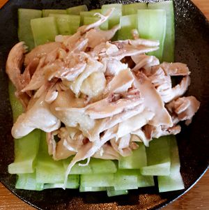 把青瓜放在盘下面 上面放撕好的鸡肉