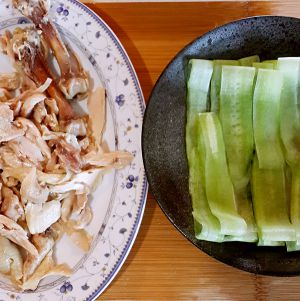 鸡放葱姜八角盐煮好,冷了捞出来切块,碗底铺一根黄瓜片,放入油辣子,花生碎,葱花,倒入橄榄油烧热芝麻下锅就关掉,把芝麻和油浇在上面,鸡汤加醋盐味精调成汁倒入碗里。