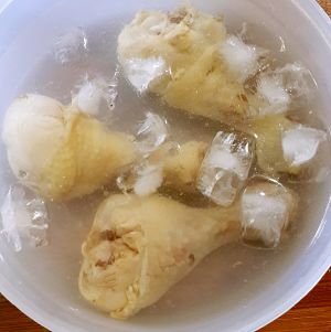 将煮好的鸡腿捞出立刻放入冷水中浸泡10分钟左右让鸡腿凉透