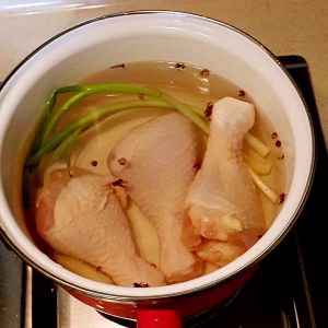 鸡腿洗净 锅里加水 加入两汤匙的料酒 半汤匙的盐 同一块姜 小葱 开火 水开转中小火煮15到20分钟