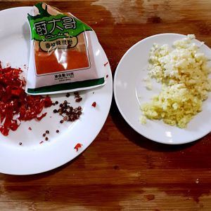 把大蒜、姜、剁成末,葱切小段,加些辣椒粉,放入碗内淋上热油