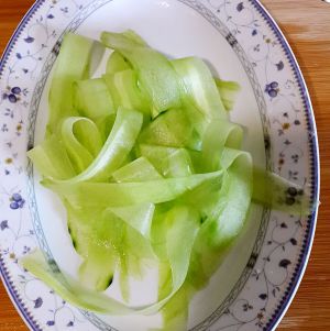青瓜去皮后 用去皮的工具刮成一片片 喜欢切丝也可以