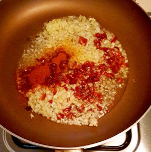 继续保持小火 倒入切好的姜蒜粒 干辣椒 辣椒粉 花椒粉 煸炒 看到出红油后