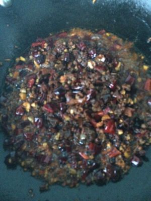锅热后放油,放入花椒、麻椒炒香,再放入干辣椒、葱姜蒜炒。