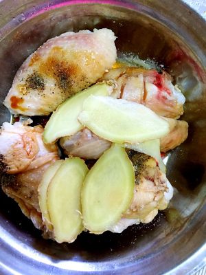 料酒15ml,生抽15ml,海天美极鲜酱油15ml,老抽10ml,黑胡椒2.5g,盐2.5g.姜片腌制