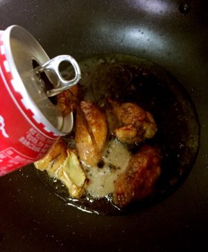 锅里放油烧热加入葱姜爆香,倒入鸡翅煸炒至两面金黄倒入老抽上色后加入少许醋黄酒和一点点盐,把可乐加入没过鸡翅