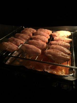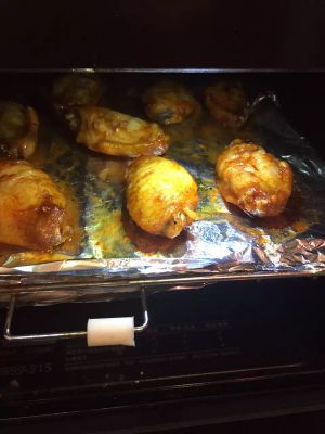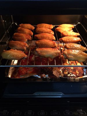 热风模式上下火160度烤15分钟,取出来刷一遍腌鸡翅的汁,再烤10分钟取出来刷一遍蜂蜜,最后烤5分钟就好了(如果不喜欢蜂蜜就跳过刷蜂蜜的步骤~直接烤30分钟就好了)
