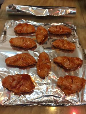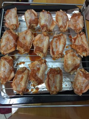 烤箱160度预热,鸡翅膀整齐码放在烤架上,放入烤箱中层,下面一层放一个烤盘铺上锡纸(比较好清洗)