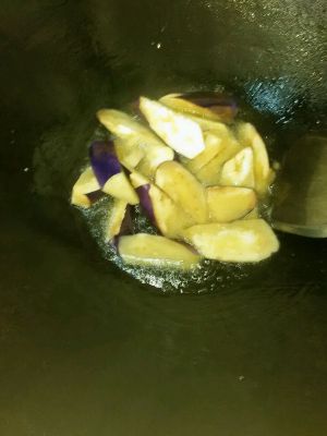 炒锅下大量油,油热后炸茄子块,炸熟后装盘