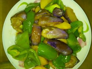 锅里放少点油,爆香葱、姜片。放入炸好的土豆茄子翻炒,放青椒,再翻炒,放盐,滴点酱油,出锅前放蒜沫,翻炒出蒜味!