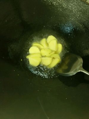 在锅内倒入适量油,把土豆炸成金黄色,收起滤油