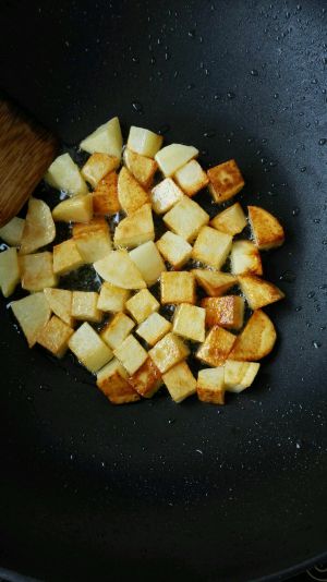 不粘锅少加一点油到入去皮切块的土豆煎至两面微黄盛出;