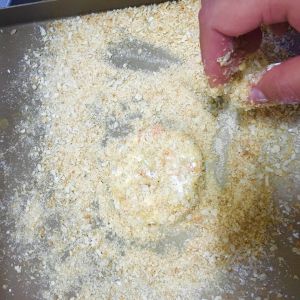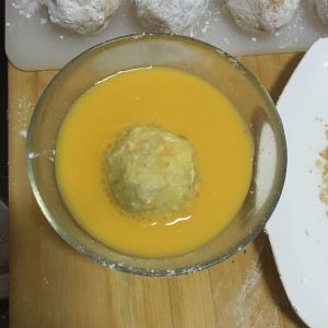 土豆泥包裹鲜虾后沾取蛋液,裹上面包糠,放餐盘备用。