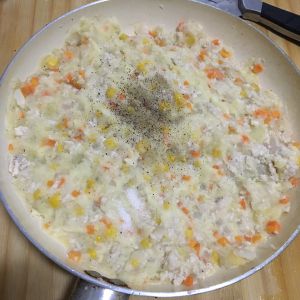 加入玉米粒,芝士碎,土豆泥。调味,盐大约2克的勺2平勺,现磨黑胡椒30转。都已经熟了,可以直接尝味道,其实现在就是土豆泥沙拉。