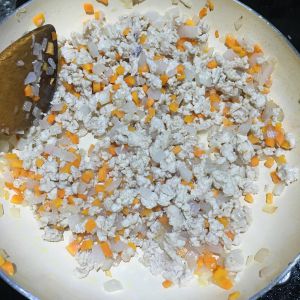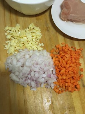 一点黄油炒熟洋葱,胡萝卜,鸡肉泥