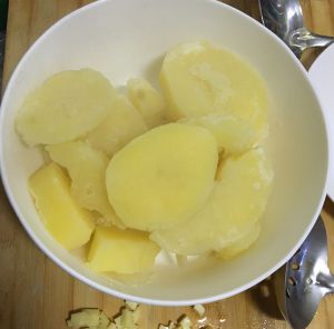 土豆洗净去皮,放入蒸锅隔水蒸熟,为了更快的蒸熟,我把土豆切成了厚片,把土豆片或土豆直接放在蒸屉上蒸,至土豆熟透。