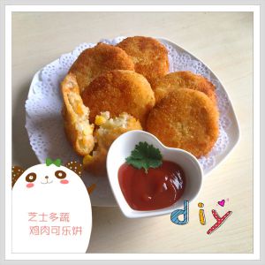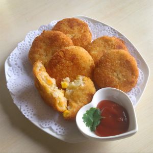 土豆泥捏圆过蛋黄芝士液,蘸上面包糠,入微波炉高火5分钟就好啦。