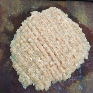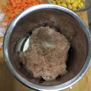 鸡肉泥入底味。加一点料酒,半勺盐,现磨黑胡椒我拧了大约7-8转。搅拌腌制5分钟。