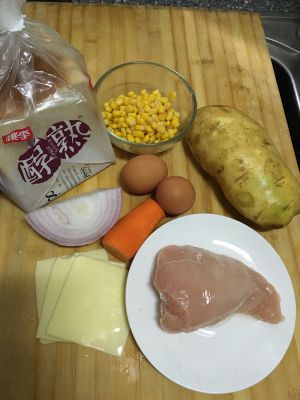 土豆很大一个,切厚片,煮熟。最好不一样厚,有些很沙有些有点脆增加口感层次。煮完土豆顺手稍微焯一下玉米粒。