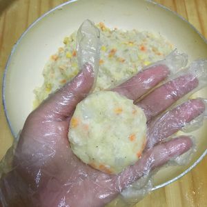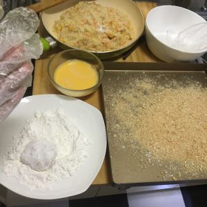 将混合好的土豆泥分成若干份,用手搓成自己想要的形状,圆柱也好,圆球也好,圆饼也好,然后再依次裹上面粉、蛋液、面包糠,这样我们的可乐饼半成品就做好了。